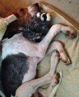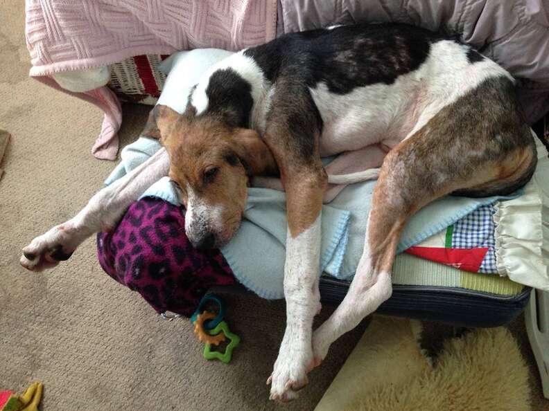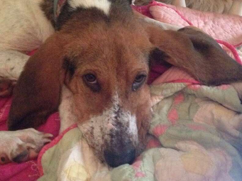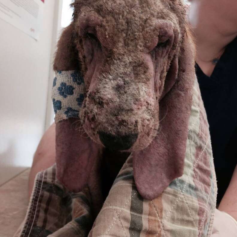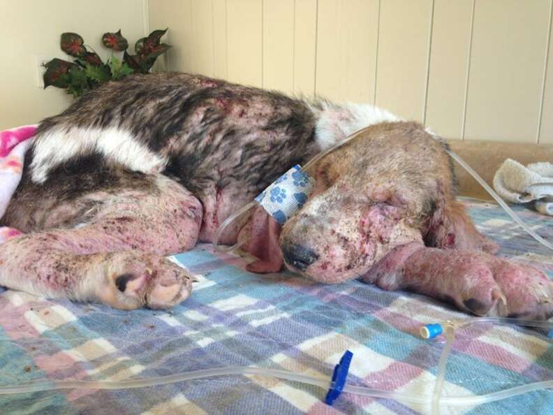 After scouring the wooded forest area, she was ready to give up. But just then her husband found the dog, lying in a patch of weeds at the end of the road. “He said, ‘Stephanie, I don’t think he’s going to live,’” Smith-Justus told The Dodo.