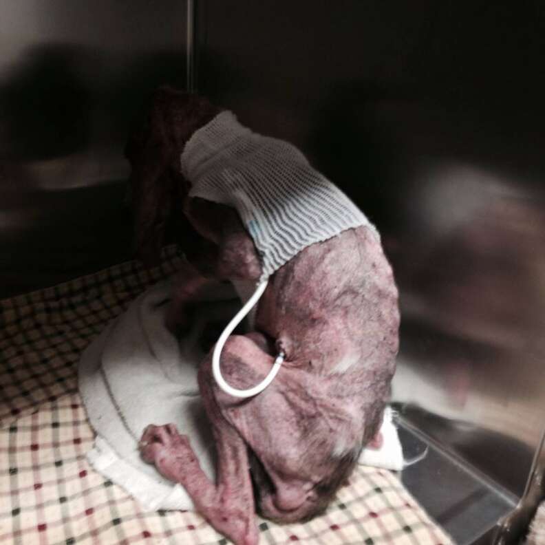 They rushed him to the vet’s clinic, where they realized his skin was just the beginning. He had been shot repeatedly with a pellet gun. He weighed just 34 pounds, and had gone so long without eating that his intestines had collapsed.