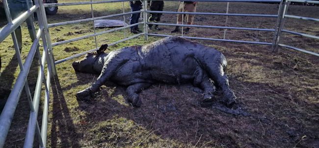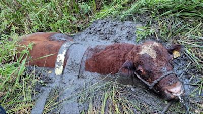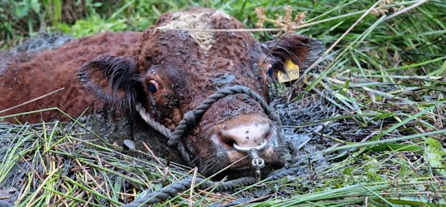 A local farmer even bought a telehandler, a machine similar to a forklift, to pull the bull from the mud on to a large glide board so he could be slid across the ground to a secure pen.
