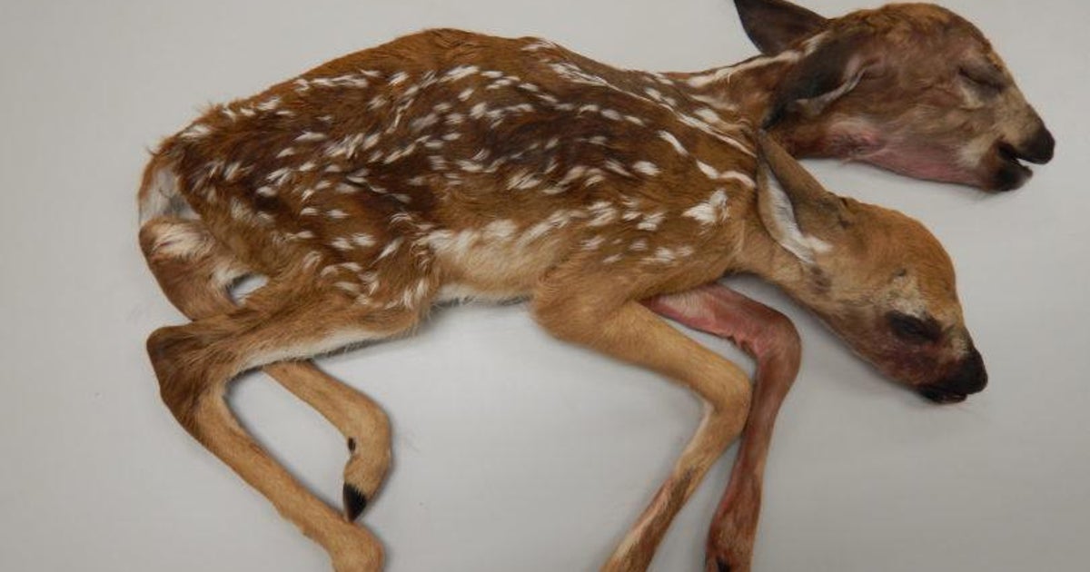 Se cree que los cervatillos, que nacieron muertos, fueron el primer caso registrado de un ciervo de dos cabezas unido que alcanzó término completo y nació de su madre, según un estudio publicado recientemente en la revista científica American Midland Naturalist. Los gemelos unidos ocurren en la población humana a una tasa de entre uno de cada 50,000 a uno de cada 100,000 nacimientos, pero el proceso que lleva a esta condición, tanto en humanos como en animales, es desconocido.
