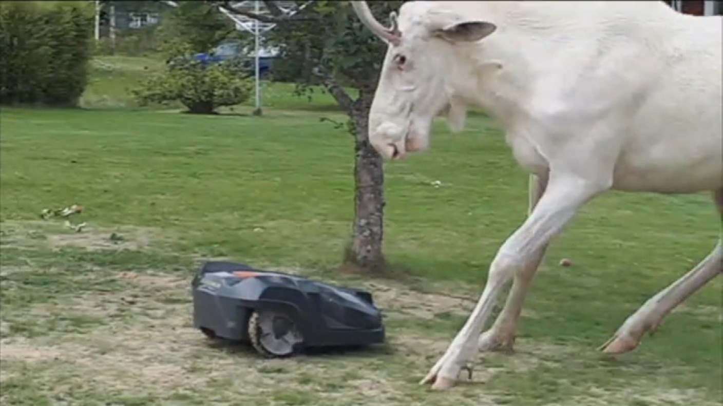 Ms Niklasson was still filming the animal when a robot lawnmower lurched into view, interrupting the moose’s mealtime and giving him a fright.