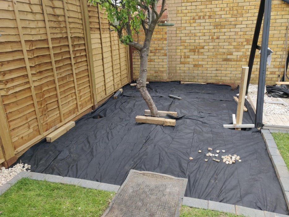 After the holes were dug I rolled out the gravel membrane and cut crosses where the posts were going.