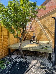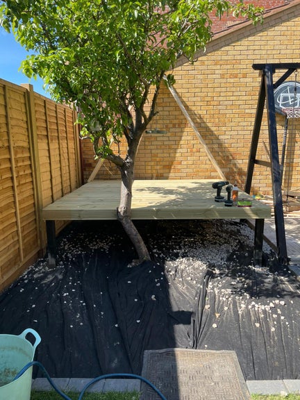 Once it was all square and level I then added the decking boards running in the opposite direction that the joists were running with around a 5mm gap between each board. This is important to note if you have a preferred direction that you want the boards to run. I recommend pre drilling the holes in the boards before adding two screws to each end of each board.