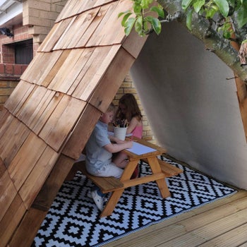 Now that the outdoor rug and small bench have been added the project is done and the kids love it.