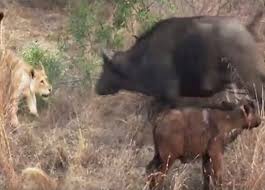 La manada, alertada por el rugido de los felinos y el chillido del ternero, reacciona con una velocidad sorprendente. Los búfalos machos, con sus cuernos poderosos y sus cuerpos robustos, se lanzan hacia los leones, formando un muro impenetrable. Las hembras, con la ferocidad de las madres que defienden a sus crías, se unen a la batalla, embistiendo a los depredadores con una furia implacable.