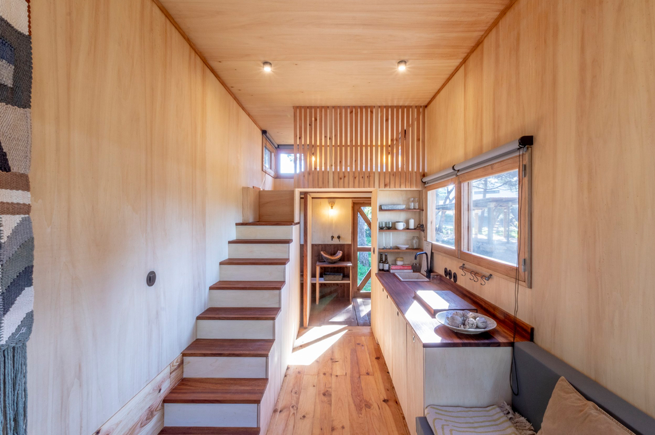 This off-grid tiny home on wheels finds space through simplicity with an open-plan interior that’s entirely paneled in wood.