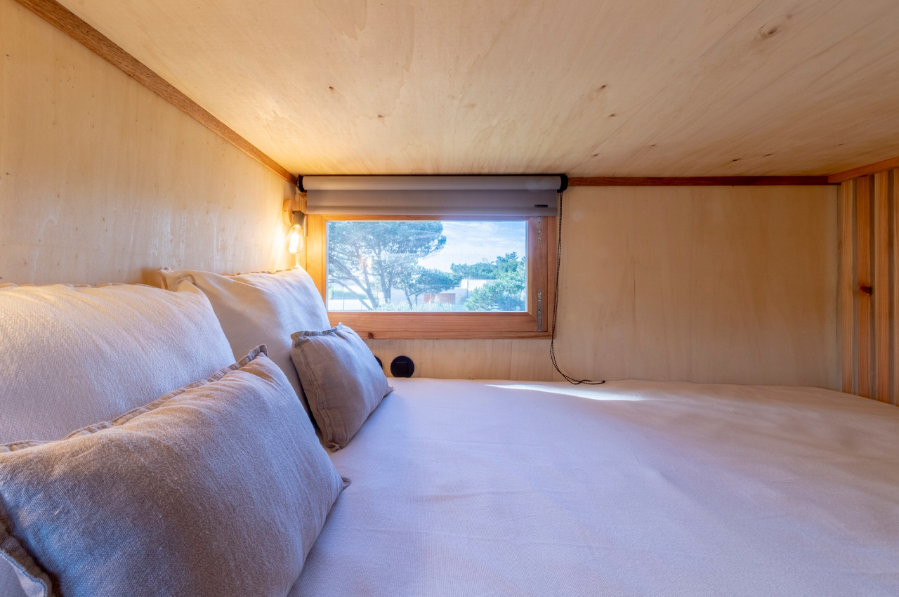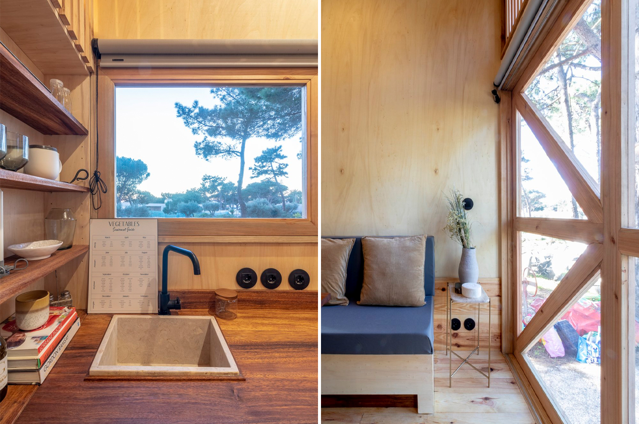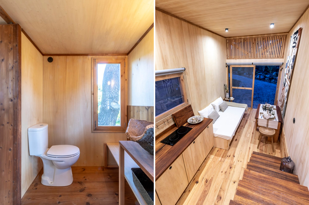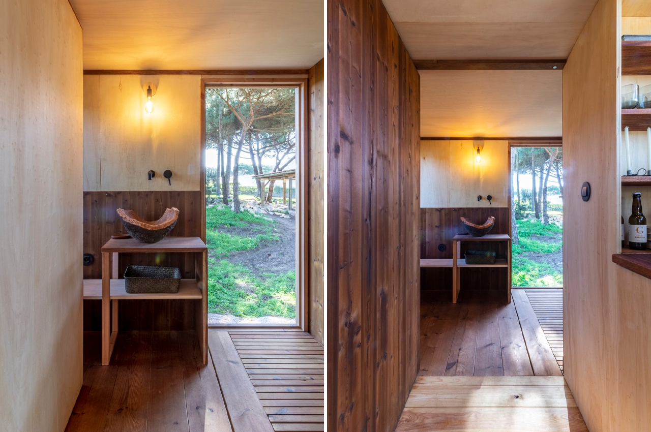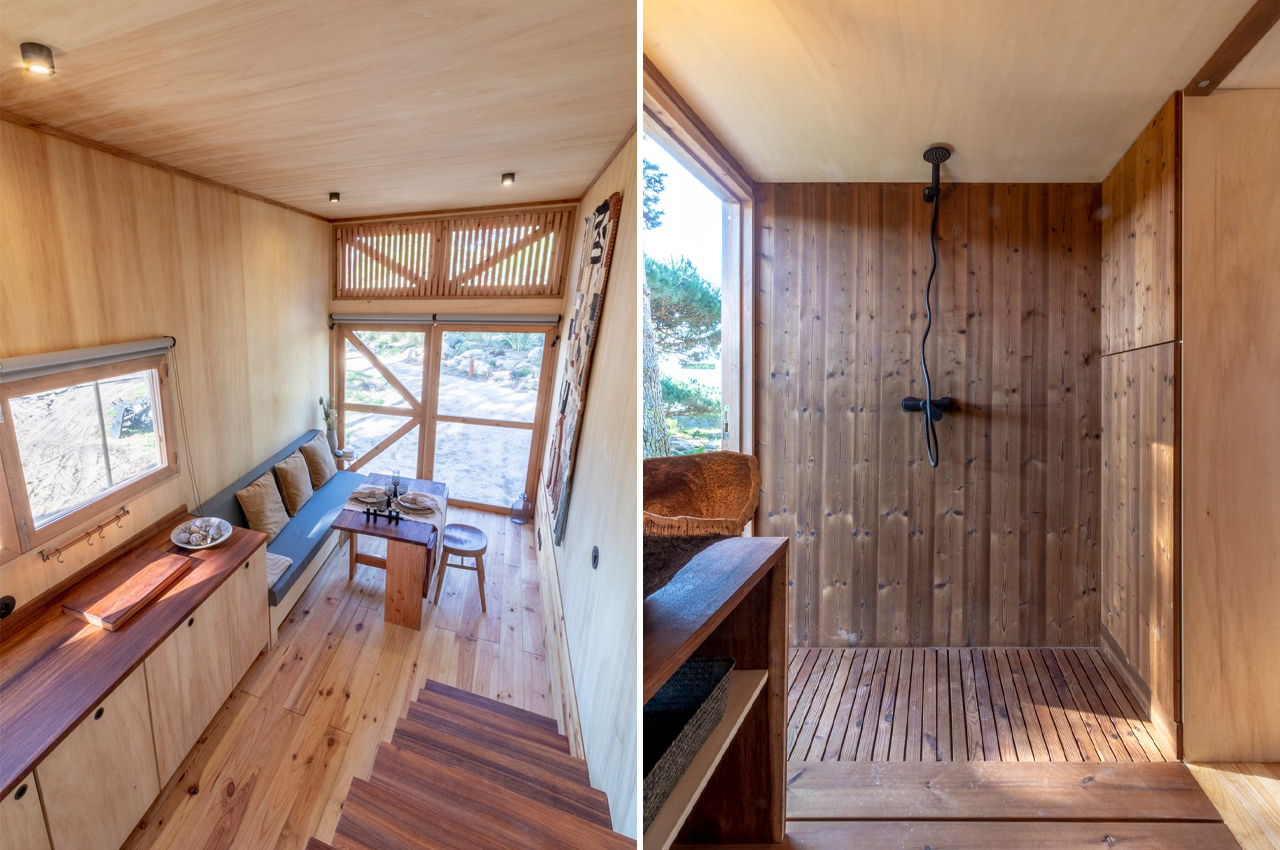 Looking at Adraga from the outside, its unstained pinewood facades invoke simplicity. Defined by a rectangular, flat-roofed silhouette, the team at Madeiguincho found movement through windows and doors. On one end of the tiny home, a single, farmhouse-style door welcomes residents into the home’s subdued bathroom. There, against the soothing backdrop of walnut wood panels, residents can enjoy a semi-outdoor shower atop wooden floor slats.
