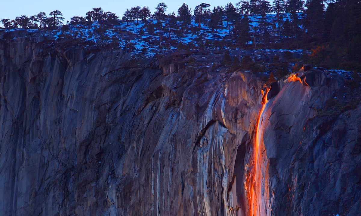 When the conditions are right in Yosemite National Park, the setting sun shines on an ephemeral waterfall called Horsetail Falls.